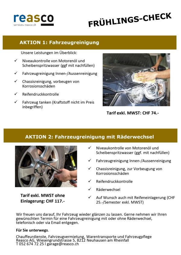 In der Reasco Garage bringen wir Ihr Fahrzeug wieder zum glänzen! Buchen Sie noch heute Ihren Termin für eine Fahrzeugreinigung mit oder ohne Räderwechsel.